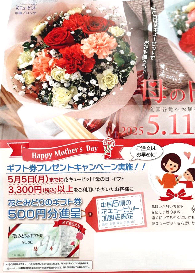母の日まであと10日ですね。 まだ贈り物を迷っていらっしゃる方は ぜひお花を贈って、お母さんを笑顔にしませんか? 定番のカーネーションの花束はもちろん カラフルな色合いのお花で素敵な母の日に。 花キューピットで5月5日までにご注文いただくと ギフト券のプレゼントを行っております。 まだ間に合いますので、お早めのご注文お待ちしております。 清水花店であなたの大切な方への贈り物をお手伝いさせてください。